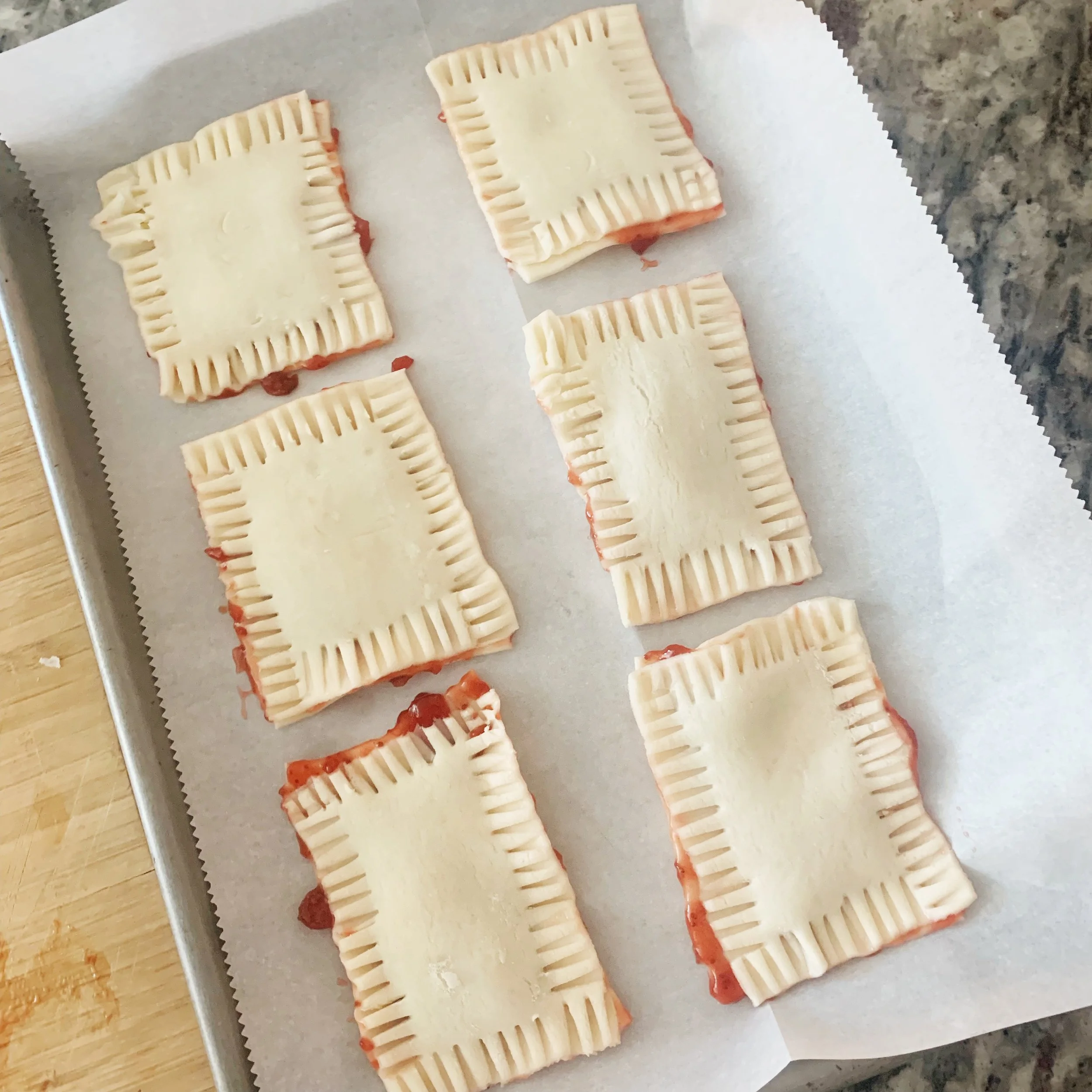 You’ll want to take a pizza cutter and then begin to cut your pop-tarts into rectangles or squares. Using a fork seam the edges together to get that pop-tart look.